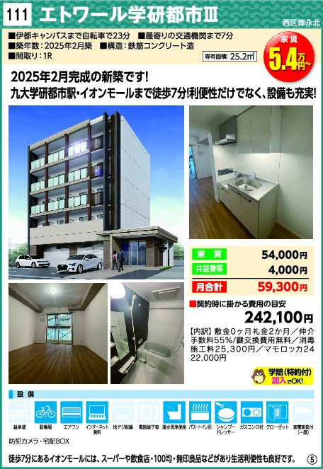 エトワール学研都市Ⅲ 2025 11/07 本物件は12月以降募集開始予定です。 ※実際と異なる場合は、現況を優先いたします。 お問合せ・お申込み お問合せ お問い合わせいただきましたら、九大生協よりご連絡致します。 2026_05 学研都市