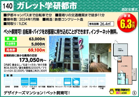 ガレット学研都市 2025 11/07 本物件は12月以降募集開始予定です。 ※実際と異なる場合は、現況を優先いたします。 お問合せ・お申込み お問合せ お問い合わせいただきましたら、九大生協よりご連絡致します。 2026_05 学研都市