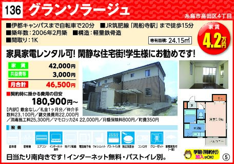 グランソラージュ 2025 10/31 本物件の募集状況はお問い合わせください。 ※実際と異なる場合は、現況を優先いたします。 お問合せ・お申込み お問合せ お問い合わせいただきましたら、九大生協よりご連絡致します。 周船寺