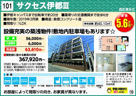 サクセス伊都Ⅲ 2025 11/07 本物件は合格前予約不可です。 ※実際と異なる場合は、現況を優先いたします。 お問合せ・お申込み お問合せ お問い合わせいただきましたら、九大生協よりご連絡致します。 2026_16 学研都市