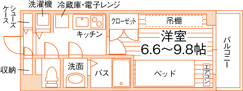 《室内設備》インターネット対応/IH+RHキッチン2口/モニター付インターフォン/暗証番号キー/温水洗浄便座/吊棚/全室家電4点(冷蔵庫・洗濯機・電子レンジ・照明器具)/ベッド