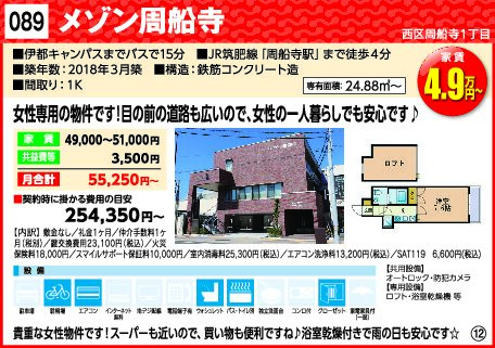 メゾン周船寺 2025 11/01 本物件は募集中です。 ※実際と異なる場合は、現況を優先いたします。 お問合せ・お申込み お問合せ 予約申込 お申込みいただきましたら、九大生協よりご連絡致します。 周船寺