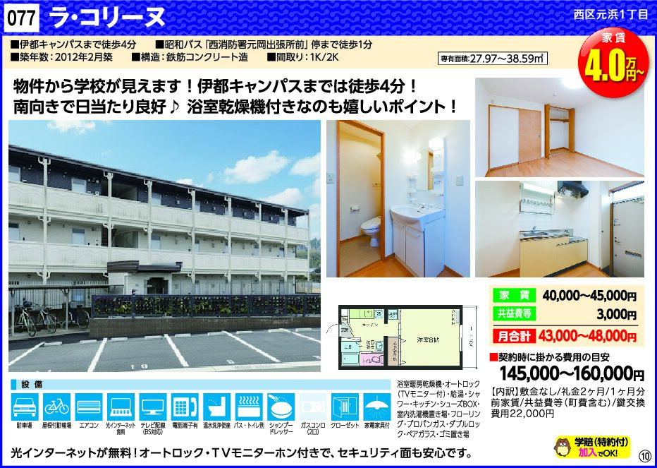 ラ・コリーヌ 2025 12/23 本物件は満室です。 ※実際と異なる場合は、現況を優先いたします。 お問合せ・お申込み お問合せ 満室 お申込みいただきましたら、九大生協よりご連絡致します。 2025_11 元浜・九大新町