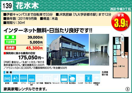 花水木 2025 11/07 本物件は12月以降募集開始予定です。 ※実際と異なる場合は、現況を優先いたします。 お問合せ・お申込み お問合せ お問い合わせいただきましたら、九大生協よりご連絡致します。 2026_05 学研都市