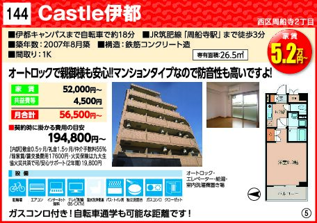 Castle伊都 2025 11/07 本物件は12月以降募集開始予定です。 ※実際と異なる場合は、現況を優先いたします。 お問合せ・お申込み お問合せ お問い合わせいただきましたら、九大生協よりご連絡致します。 2026_05 周船寺
